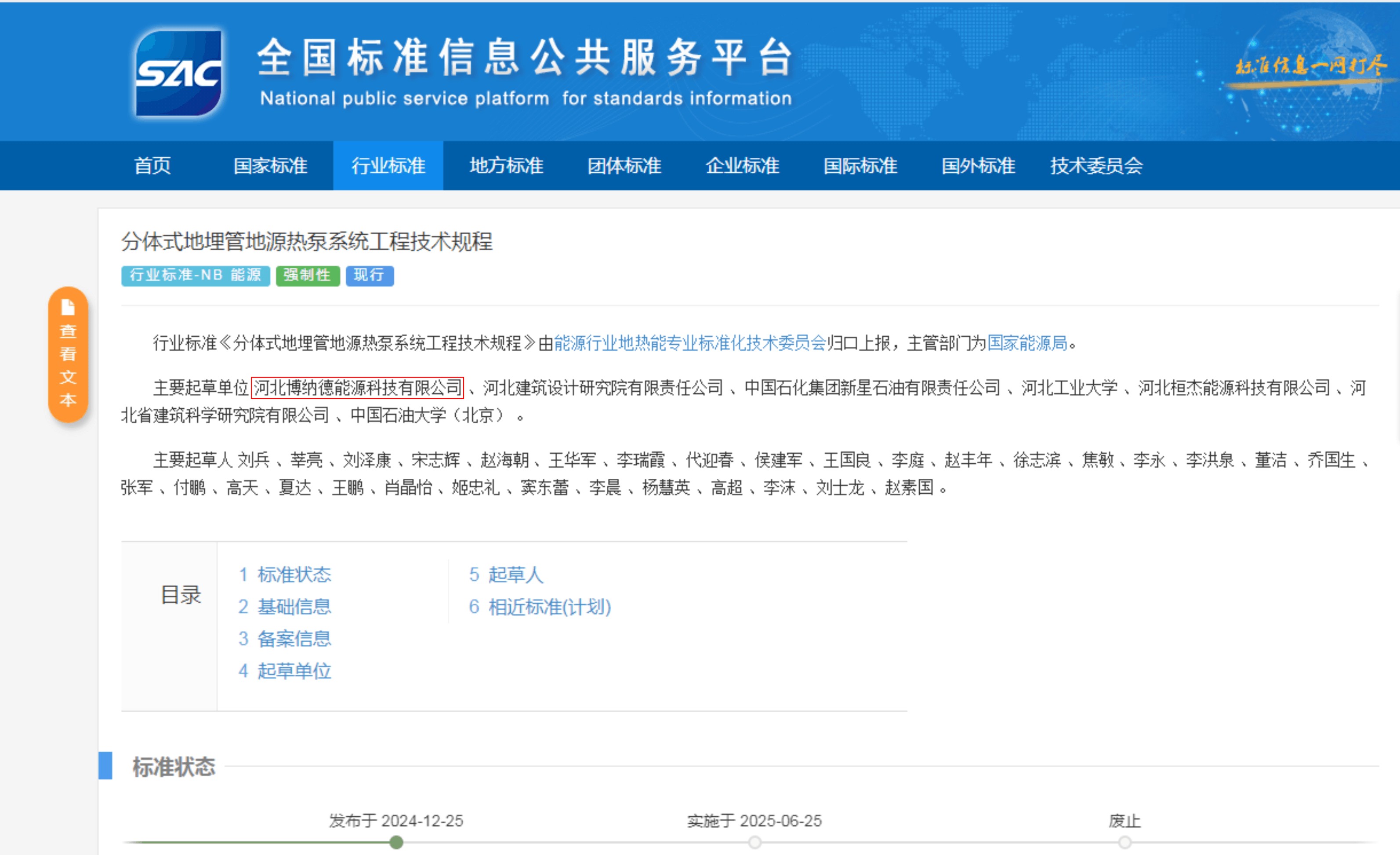 由河北博納德能源科技有限公司主編的NB/T11692-2024《分體式地埋管地源熱泵系統(tǒng)工程技術(shù)規(guī)程》行業(yè)標(biāo)準(zhǔn),于2025年6月25日正式實(shí)施。作為地?zé)嵝袠I(yè)的重要標(biāo)準(zhǔn),該規(guī)程聚焦地?zé)崮荛_發(fā)利用的關(guān)鍵環(huán)節(jié),為地?zé)崮荛_發(fā)利用產(chǎn)業(yè)提供了全面、權(quán)威的技術(shù)依據(jù)和操作指南,將有力推動產(chǎn)業(yè)向高質(zhì)量發(fā)展邁進(jìn)。