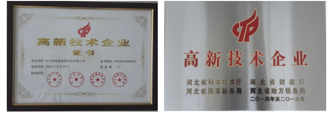 日前,河北博納德能源科技有限公司順利通過河北省科學技術(shù)廳、河北省財政廳、河北省國家稅務(wù)局、河北省地方稅務(wù)局的審核,獲得“高新技術(shù)企業(yè)”榮譽稱號,并頒發(fā)了認定證書和牌匾。