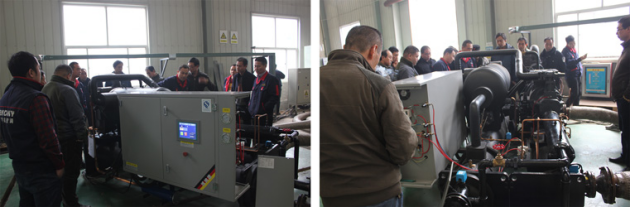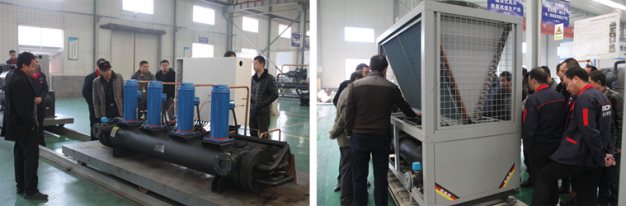 會(huì)議期間,大家互相溝通。座談會(huì)上各經(jīng)銷商就市場(chǎng)運(yùn)營(yíng)的狀況和面臨的問(wèn)題展開了積極討論。交流會(huì)后,與會(huì)經(jīng)銷商到車間參觀了新研發(fā)機(jī)組,在實(shí)驗(yàn)室現(xiàn)場(chǎng)觀看了高溫?zé)岜脵C(jī)組出水溫度可達(dá)80℃。該機(jī)器可直接拆換原有的燃煤鍋爐,并使用原來(lái)的鍋爐房,機(jī)房只需新增水量平衡罐,更換室內(nèi)循環(huán)水泵;室外需施工地埋側(cè)換熱器或水源井。該機(jī)組能效比(出水溫度60℃時(shí))能效比:3.0,即輸入一度電可產(chǎn)生3kW熱量,比普通空調(diào)節(jié)能2倍,比電暖器的節(jié)能3.3倍 。